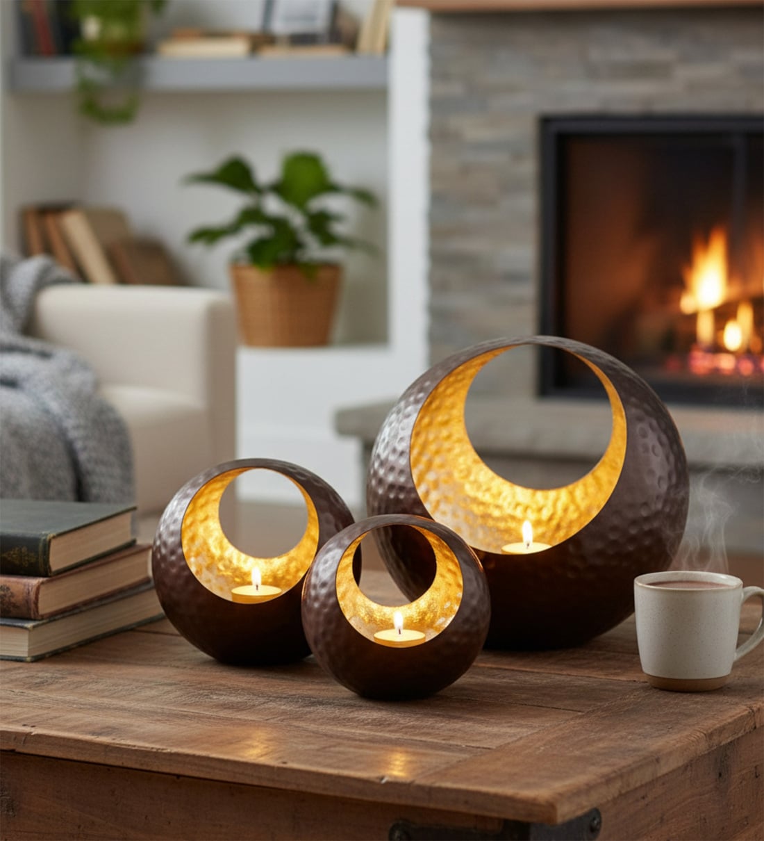 KREATIVE ART S Enjoy Decorating Your Table With Our Crescent Moon Table Candle Holder Set Of 3. These Candle Holders Will Make Any Venue More Mood-Enhancing. I Think You Should Buy This Set For The Upcoming Holidays, Like Christmas Or Halloween. Because It Looks Very Good. These Bedside Table Decor Ascents With Unique Colors Bring The Spirit Of The Season To Your Home, Adding A Simple Yet Elegant Touch To Your Decor. Designed With Simple Elegance, These Moon Candle Holders(Set Of 3 Pieces) Are Certain To Bring Light To Any Event Or Occasion You Host. The High-Quality Metal Is Intricate Indian Handicrafts Made By Our Skilled Artisans In India. Features No Of Pcs :- Set Of 3 Different Sizes Size:-S- 6"/M-9"/L-12" Material - Mild Steel Colour:- Gold Leafing Handmade Iron Collectible Metalware Tip: After Those Votive Candles Burn Out, Remove The Empty T Light Containers And Buy Only Tea Light Candle To Replace Inside! Care:- Don T Use Harsh Chemicals To Clean Just Use Soft Cotton Cloth To Maintain.