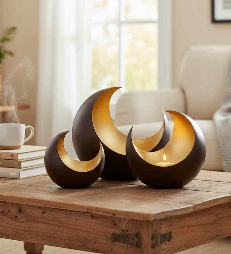 Enjoy decorating your table with our Crescent Moon Table candle Holder set of 3. These candleholders will make any venue more mood-enhancing. I think you should buy this set for the upcoming holidays, like Christmas or Halloween. Because it looks very good. These bedside table decor ascents with unique colors bring the spirit of the season to your home, adding a simple yet elegant touch to your decor. Designed with simple elegance, these moon candleholders(Set of 3 pieces) are certain to bring light to any event or occasion you host. The high-quality metal is intricate Indian handicrafts made by our skilled artisans in India Size:-S- 6"/M-9"/L-12" Material - mild steel Colour:- Gold Leafing Handmade Iron collectible metalware Made in INDIA All the products are handmade, so they may vary slightly. Care - Normal Wipe Cleaning. No use of acidic content, Height: 12 inches Width: 12 inches Depth: 5 inches