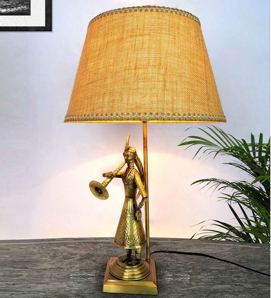 This classic table light offers an authentic, nostalgic feel while creating a unique and special-looking decor. It features a hand-crafted brass dainty sculpture of a village woman holding a flute in an antique finish with a tapered jute shade which provides a natural, earthy appearance. This table lamp is sure to add some serenity and a peaceful ambience to your place. It is perfect for placing on your nightstand or side table beside the sofa.