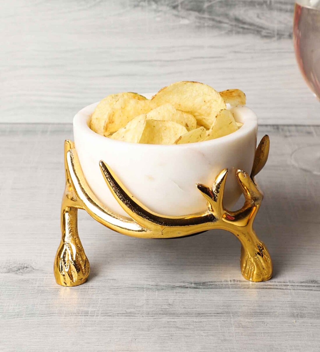 About this item Material : Solid Marble and Cast Aluminium Antler Stand with Electroplating Size: Width : 14 Cm and Height : 8 cm || Weight : 1300 Grams Multi- utility Bowl || Serving Bowl || Decorative Bowl || Home Decor || Kitchen Decor || Garden Decor || Desert Bowl || Soup Bowl || Snacks Bowl Elevate your Dining or table setting in brilliant, paramount practicality with the Marble Bowl antler Stand exclusive and Unique creation made by Heart This is a product designed emotionally made by rural artist as a skilled ARTISAN CRAFTSMANSHIP. A very appealing Eye catching, ethnic, Antique traditional style master piece .All are Handmade so some imperfection might occur
