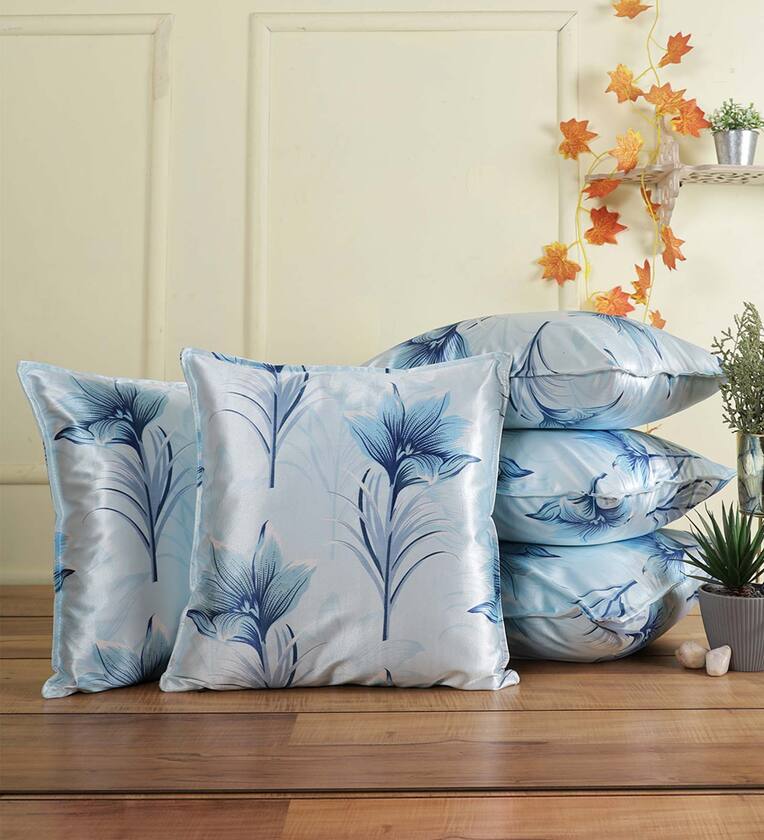 Aqua Floral Polyester Blend 16 x 16 Inches Cushion Covers (Set of 5)