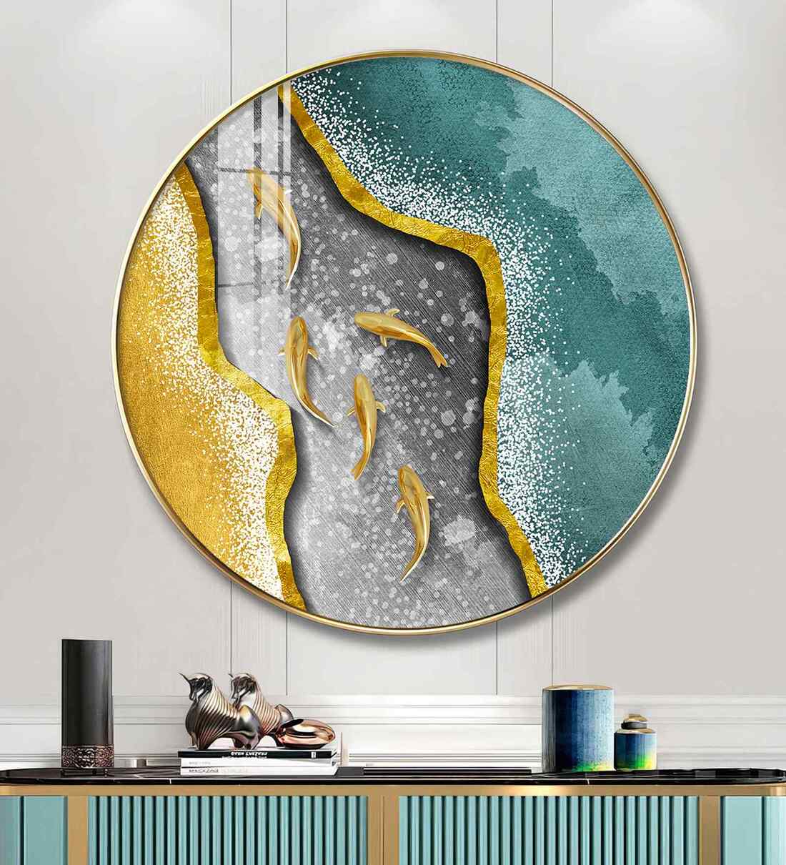 Bring home the timeless elegance of nature with our Aqua Gold Wood Glass Finish Round Wall Art. The vibrant hues and intricate detailing of the design, a perfect balance of grace and grandeur, making it a captivating centerpiece for your living room, hallway or bedroom. Designed to symbolize prosperity, beauty, and positivity. High-definition print, Durable long-lasting quality material wall art perfect for modern and traditional interiors