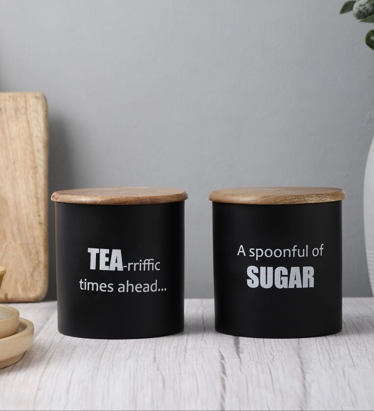 Ardura Black Metal Tea Sugar Small Containers with Wooden Lids Set of 2