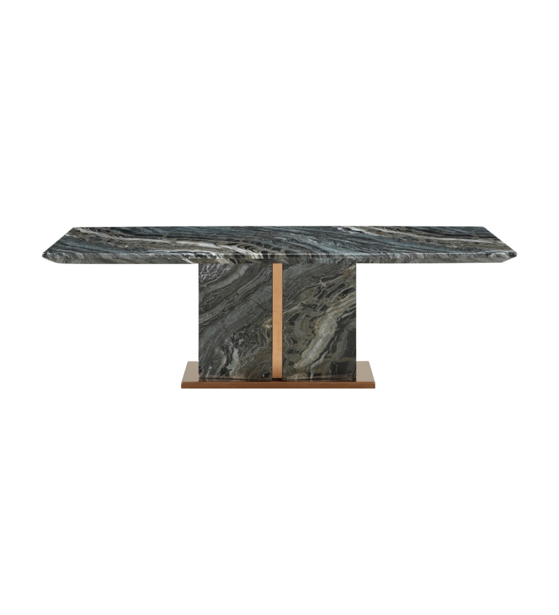 ARESSO Ideal for every home, this stylish coffee table made from the natural stone with faux marble high-shine pattern in dark grey color for a luxurious look whilst stainless steel adds a stunning contrast for your room. The smooth surface adds to the elegance and sophistication to your living area so you can easily mix with all interior styles. Material -Top Natural stone finished with dark grey glossy marble pattern. -Leg Natural stone finished with glossy marble pattern and decorated with polished rose gold stainless steel trim. Size : 140x70x45 CM - Perfectly combines with other furniture in the Aresso series.