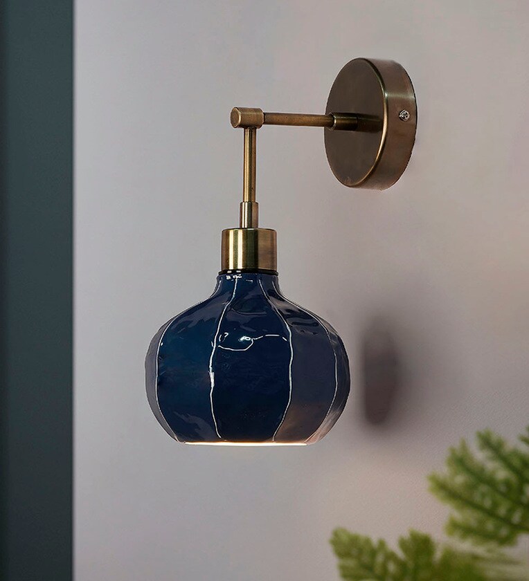 Bring playful, modern design to your walls with this unique melon-shaped sconce. The small metal shade features a striking, deeply saturated blue enamel finish complemented by charming hand-painted, uneven white lines that follow the segments. A key feature is the shade's undulated and uneven surface texture, which adds an artisanal, sculptural quality and makes the light diffuse beautifully. It provides a beautiful, focused downward glow. The shade is supported by a sleek, L-shaped arm crafted from mild steel with an Antique Brass finish, giving it a warm, sophisticated contrast.