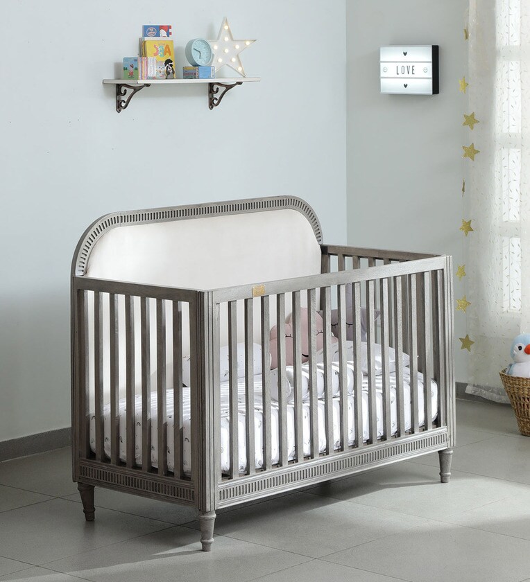 Expertly crafted of solid mango wood and finished in a weathered varnish and paint that is child safe and water based, this wooden cot has an exquisite moulding pattern that offers enduring beauty and a timeless feel in the nursery. Sturdy and built to last this cot is made of solid mango wood. It has turned legs and wooden spindles that lend a classic look, while the headboard that is cushioned with pastel velvet fabric provides for extra safety and balance. The open slats on three sides make it airy, providing the perfect view of your baby while they are asleep or playing in the cot. This wooden cot from Sadora Baby makes for a comfortable sleep space for your growing child. The back of the headboard and base of the mattress are made of MDF. Available in 3 different finishes - White Duco paint, Ash Grey varnish and Oat varnish. Mattress to fit the cot is sold separately.