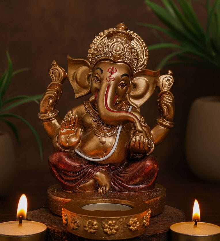 Ashnam Ganesha Figurine with T-Light Holder - Gold & Red, 17.4cm Casacraft from Pepperfry with Co-brand by Ashnam