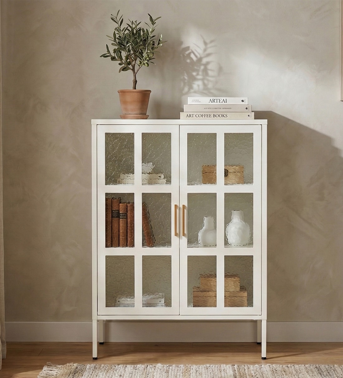 Astra Metal Crockery Unit with Glass Panel Doors Adjustable Shelving and Powder-Coated Metal Frame