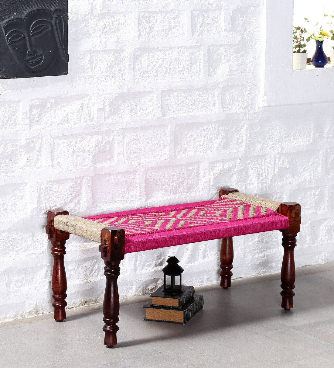 Avapana Solid Wood Bench with Jute Weaving in Pink Colour