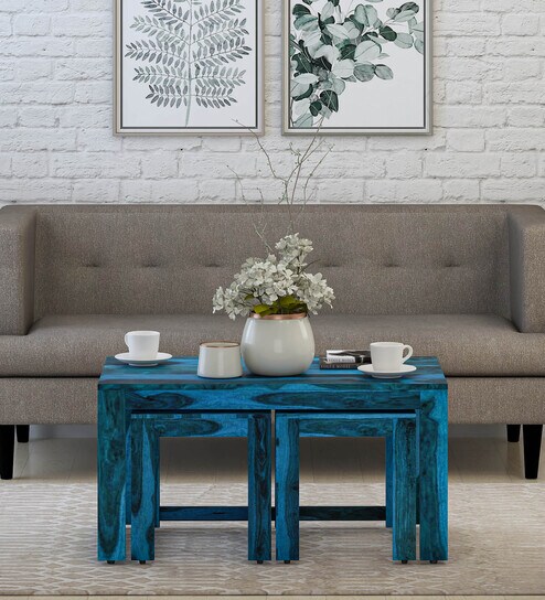 Avian Sheesham Wood Nesting Coffee Table Set in Ocean Blue Finish With Stools