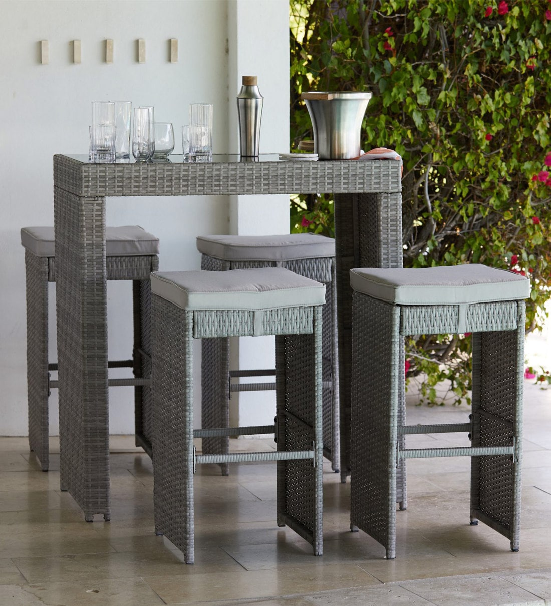 the Coral Coast Pembrey Rattan 5 Piece Outdoor Bar Set take you there. With a spacious bar table and four cozily cushioned stools, this set serves up seating for every friend waiting to imbibe your first (or latest) inventions. Durable steel frames keep each piece of this entertainment set firmly in place, even when the wind picks up. Densely woven all-weather rattan wicker in gray adds shape and subtle texture at home in outdoor settings. On top of each stool is a pale cream cushion, while the table is topped with easy-clean clear tempered glass - a must during every party. When the festivities or the season winds down, the stools tuck up under the table for compact storage. Do alfresco entertaining differently with this Hayneedle-exclusive ensemble.