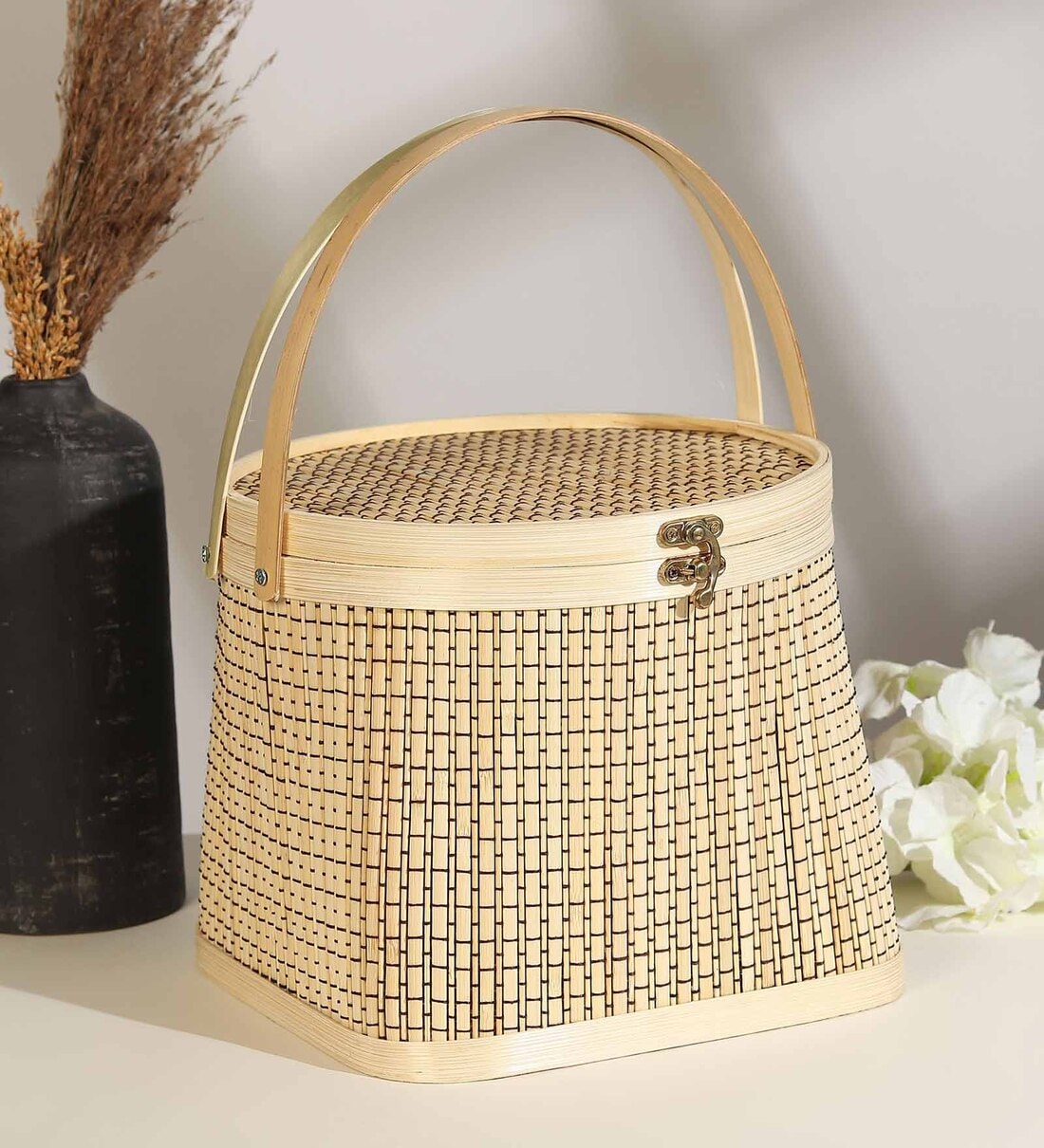 Basket for Lunch | Wicker Morden Picnic Basket | Bamboo Picnic Basket with Top Handle | Ideal for Outdoor Dining and Family Picnics (Beige)