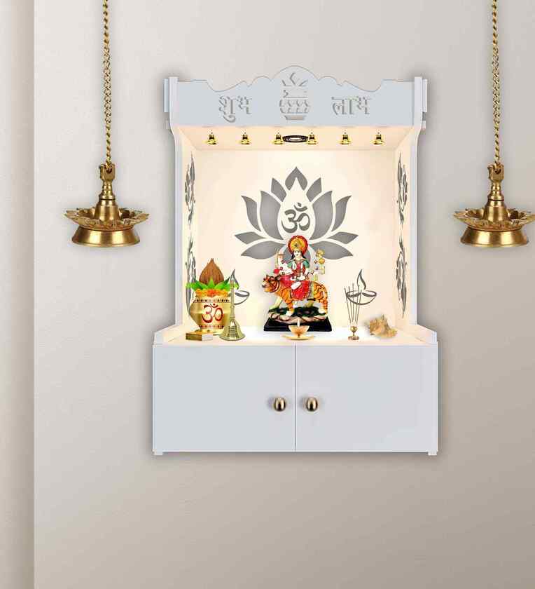 Beautiful Lotus Pattern White Wooden Wall Temple for Home With Inbuilt focus Lights & Spacious Shelf