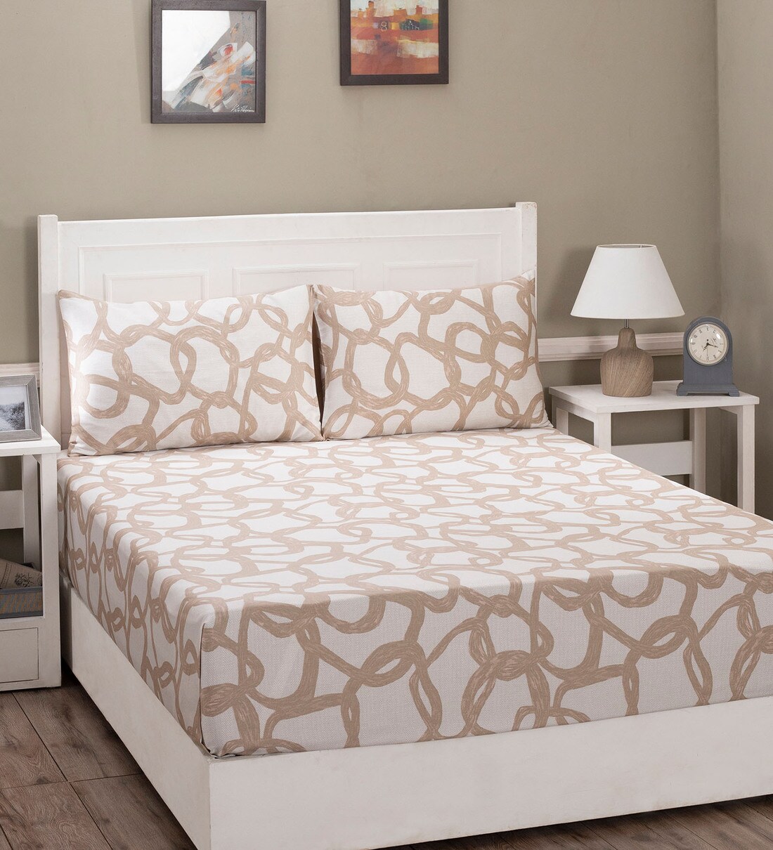 Beige Abstract 210 Tc 100% Cotton King Bed Sheet With 2 Pillow Covers Art Nouveau Collection