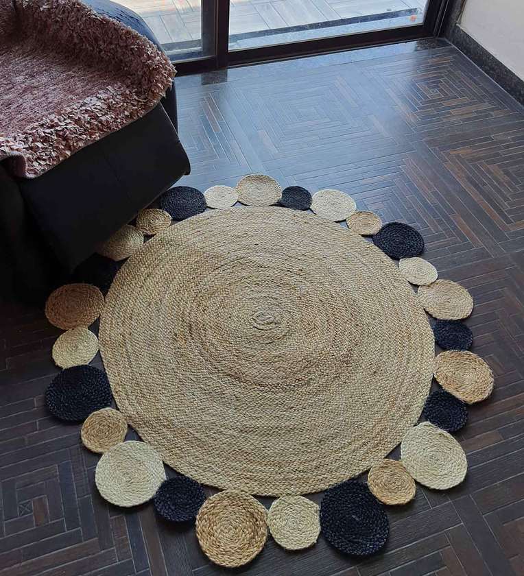 Beige and Black Geometrical Jute Hand Woven 4 X 4 Feet Round Carpet