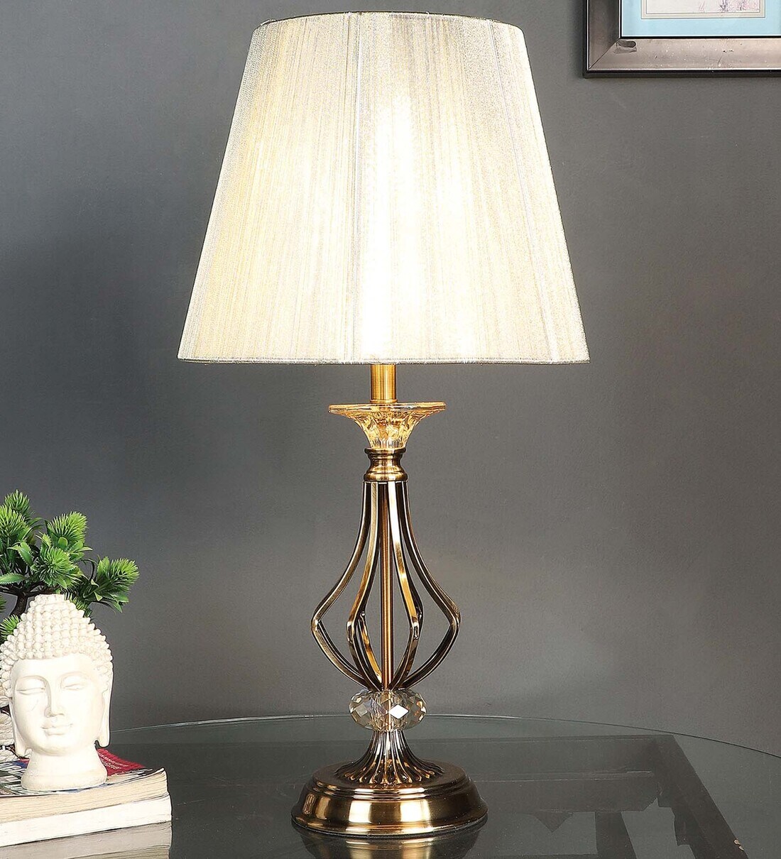 Beige Brown Nylon Thread Shade Table Lamp With Metal Base