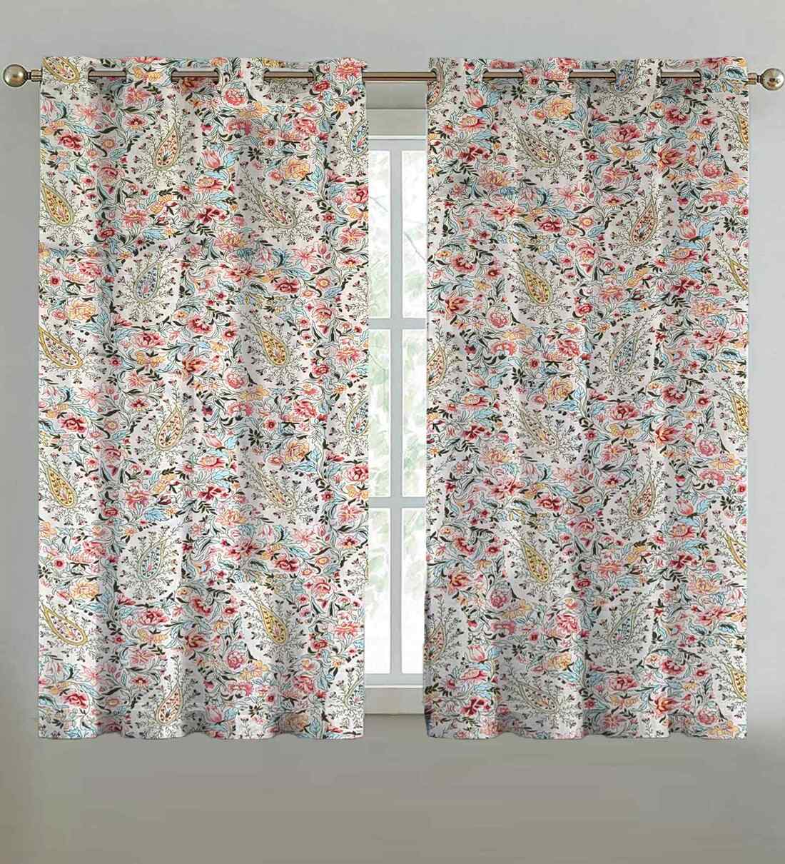 Beige Cotton Floral 5ft Eyelet Window Curtains (2 Pcs)