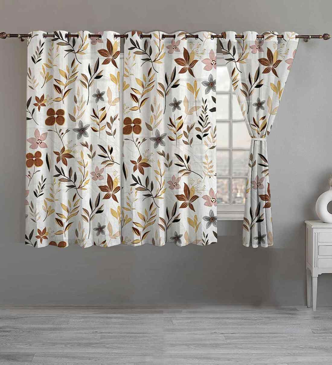 Beige Cotton Floral 5ft Eyelet Window Curtains (3 Pcs)