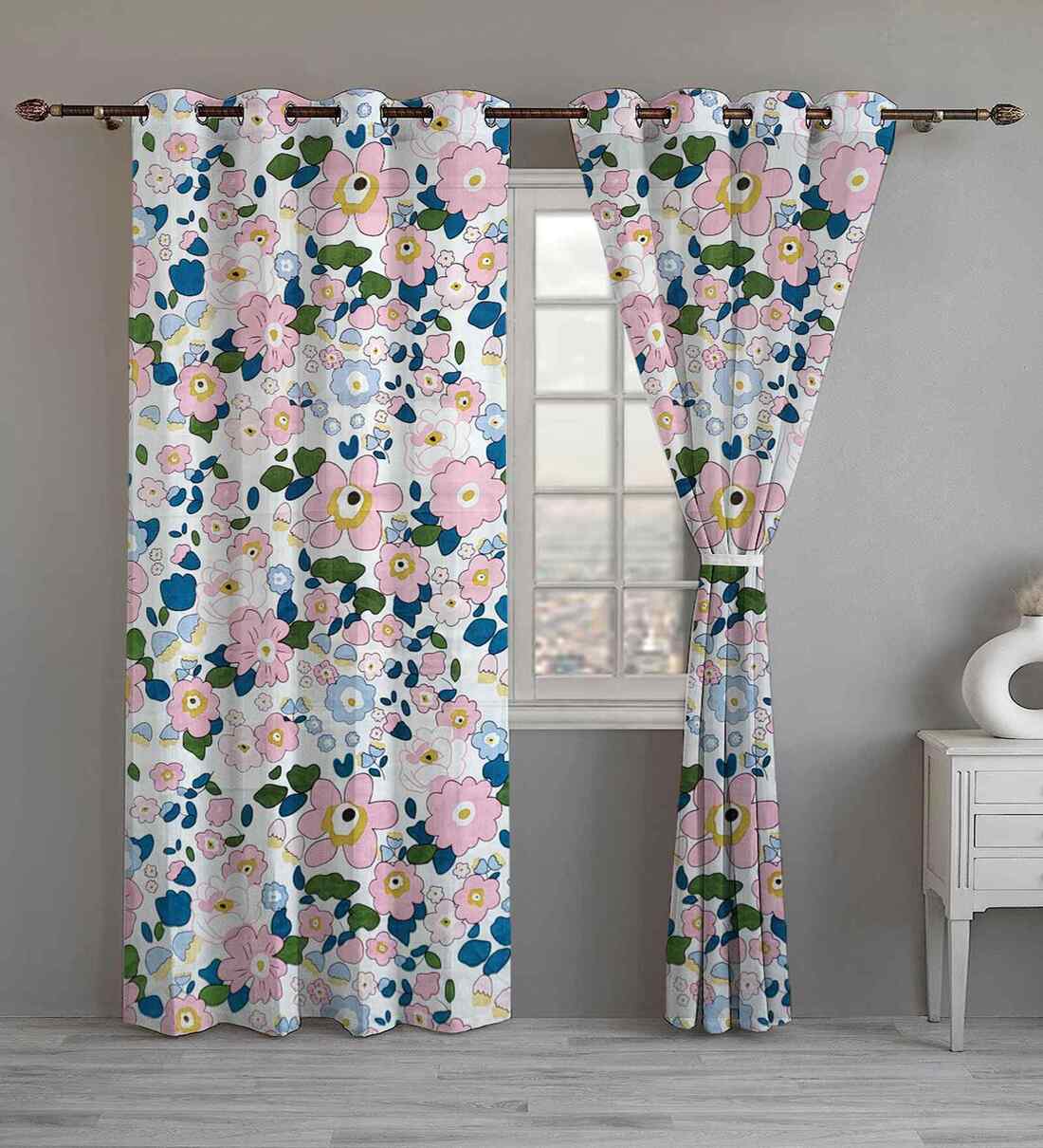 Beige Cotton Floral 7ft Eyelet Door Curtains (2 Pcs)
