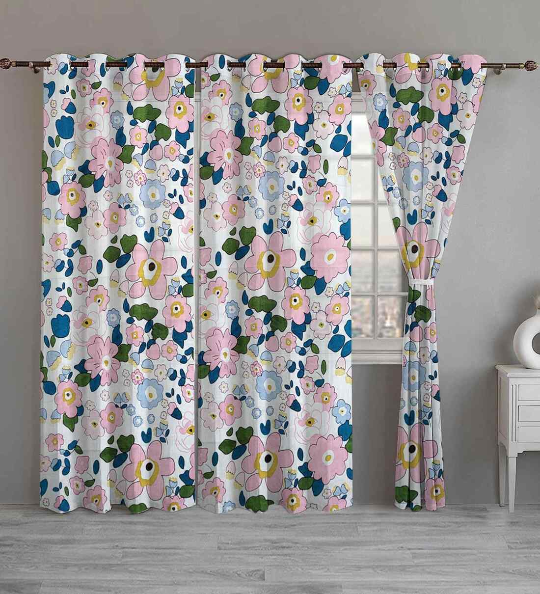 Beige Cotton Floral 7ft Eyelet Door Curtains (3 Pcs)
