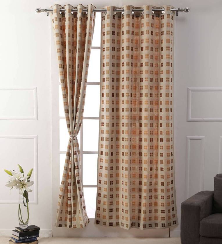 Beige Cotton Geometric 9ft Light Filtering Eyelet 1 Pc Door Curtain