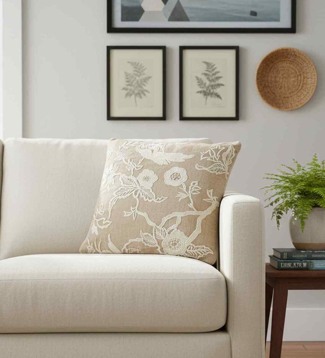 Beige Cotton Linen Florista- Embroidery 18X18 Inches Knitted Cushion Cover