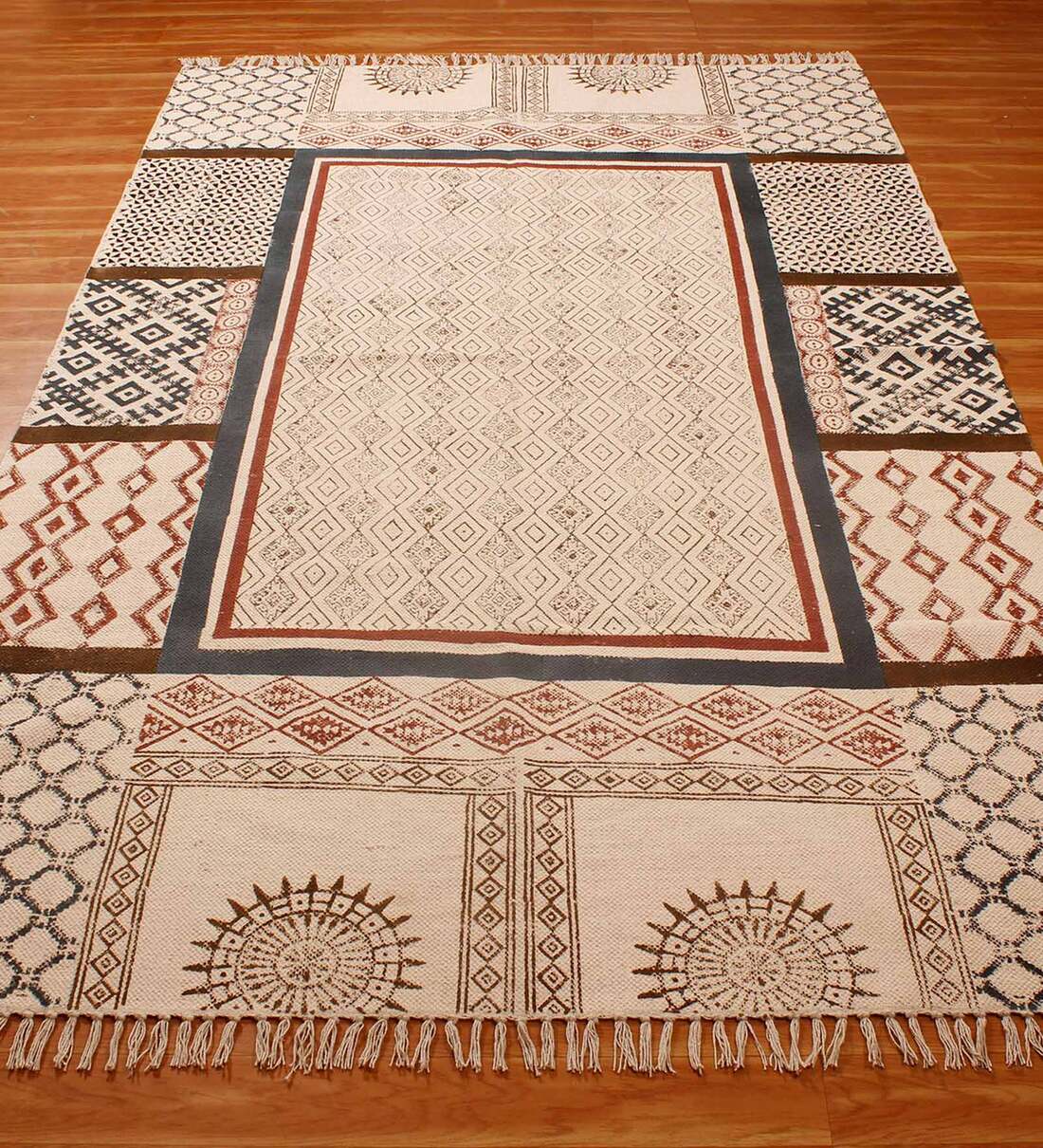 This is a beautiful handmade Cotton kilim rug weaved on Indian looms stamped with natural vegetable-dyes using hand-made wooden blocks achieving the perfection of block printing art of Jaipur. This is best suitable for your home office entrance, bedroom, living room, kids room, dinning room, kitchen and outdoor patio, terrace, beach and garden. All the materials and color dyes used in this beautiful handmade rug are sustainable and eco-friendly.