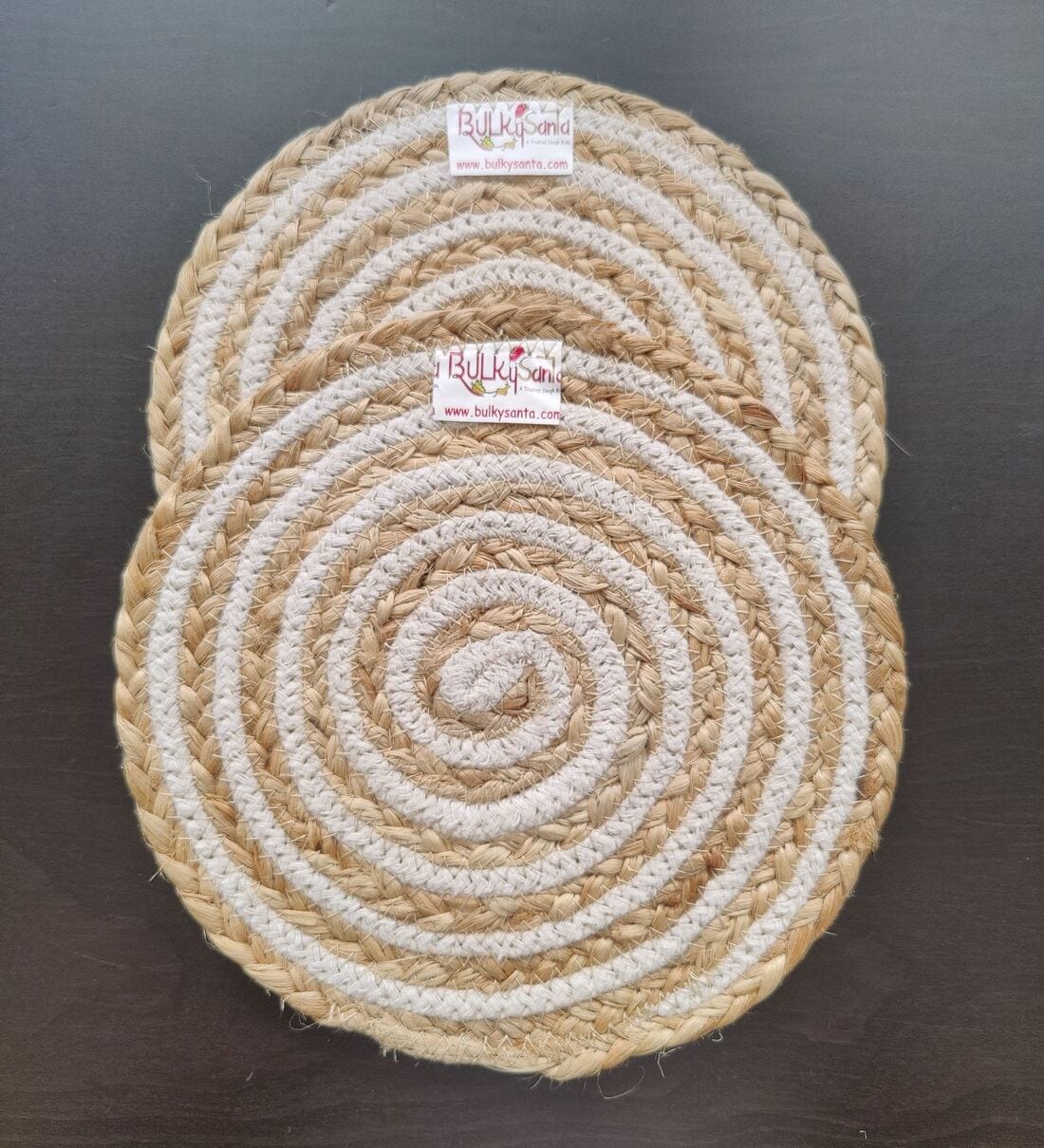Pack of 2 placemats. Scratch and noise resistant. Reversible Use and machine washable. Useful for hot pans, pots for general decoration like wall d cor. Non-slippery, heat-insulating, colour-fast, odourless, environment friendly. Material Made of high-quality cotton. Shape: Round, Size: 23 cm. Great for daily use or special occasions. These beautiful bulkysanta's placemats or placement mats are eco-friendly and curated with love by our local artisans.
