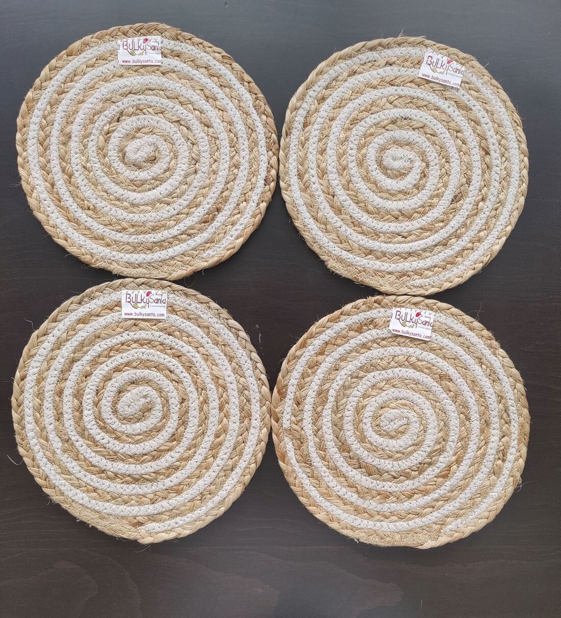 Pack of 4 placemats. Scratch and noise resistant. Reversible Use and machine washable. Useful for hot pans, pots for general decoration like wall d cor. Non-slippery, heat-insulating, colour-fast, odourless, environment friendly. Material Made of high-quality cotton. Shape: Round, Size: 23 cm. Great for daily use or special occasions. These beautiful bulkysanta's placemats or placement mats are eco-friendly and curated with love by our local artisans.