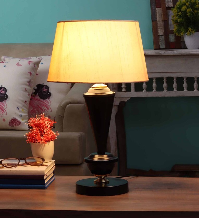 Beige Fabric Shade Table Lamp with Black Base
