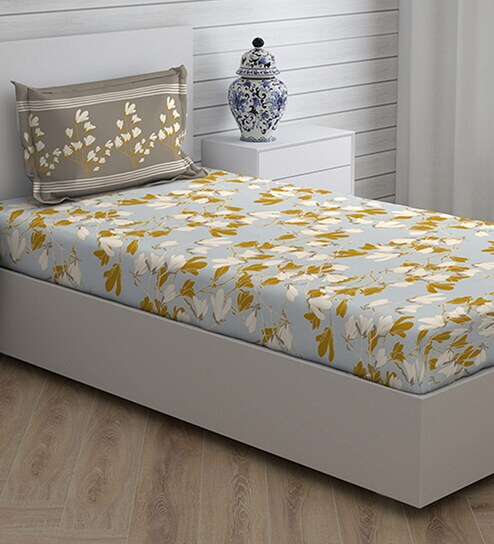 Beige Floral 104 TC Cotton Single Bed Sized Bed Sheets With 1 Pillow Cover