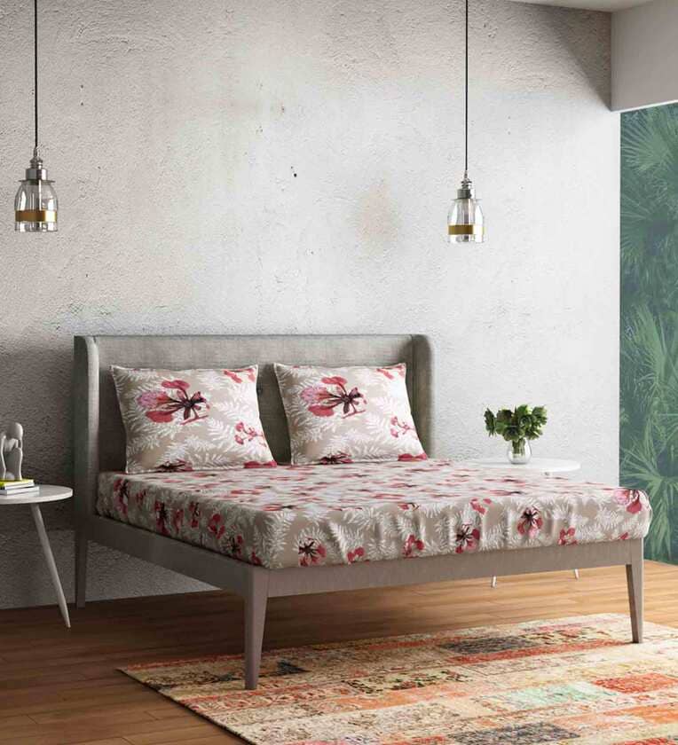 Beige Floral 300 TC 100% Cotton King Sized Bed Sheets with 2 Pillow Covers