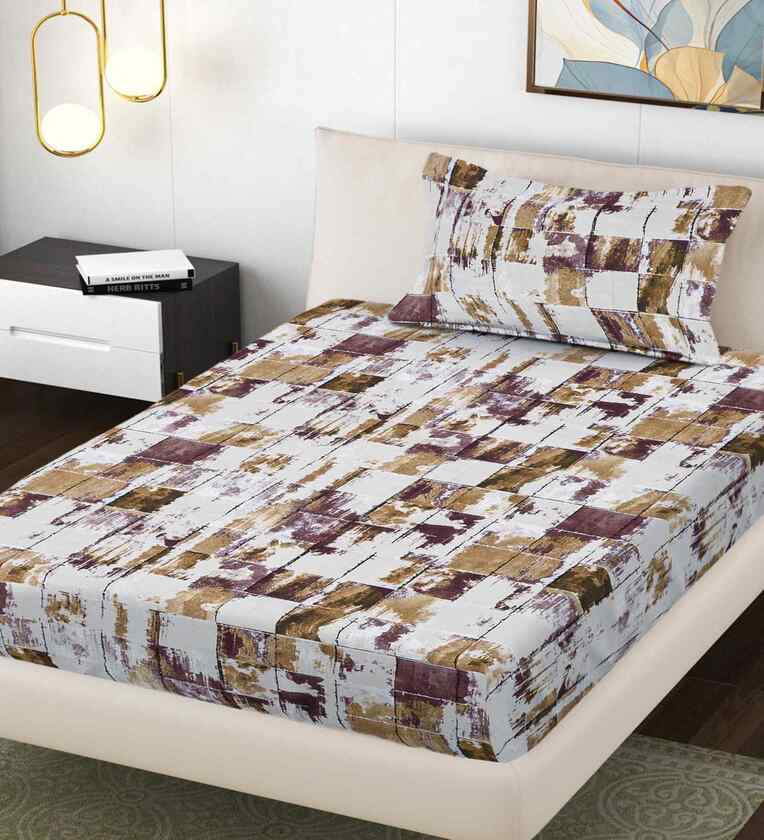 Beige Geometric 300 TC Cotton Blend Single Bedsheet with 1 Pillow Cover