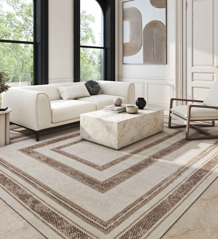 The Camel Light beige rug adds a warm and elegant touch to your home. Its simple border design in camel and light beige creates a classic look. This machine-made rug for living room is durable and soft and made in Turkey with 75% polypropylene and 25% polyester. The 5mm low pile height feels smooth underfoot and is easy to clean. Measuring 160x230 cm (5x7.6 feet), it works well in living rooms, bedrooms, or offices. Just vacuum regularly and spot clean to keep it looking fresh.