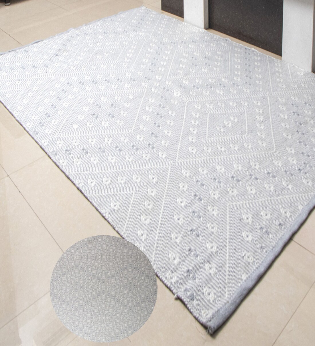 This area rug features a meticulously handwoven geometric motif, adding a playful and modern touch to your living room. It elegantly combines a diamond pattern with a palette of grey and pink, serving as the ideal finishing touch that seamlessly complements any decor style, be it traditional, boho, or modern.