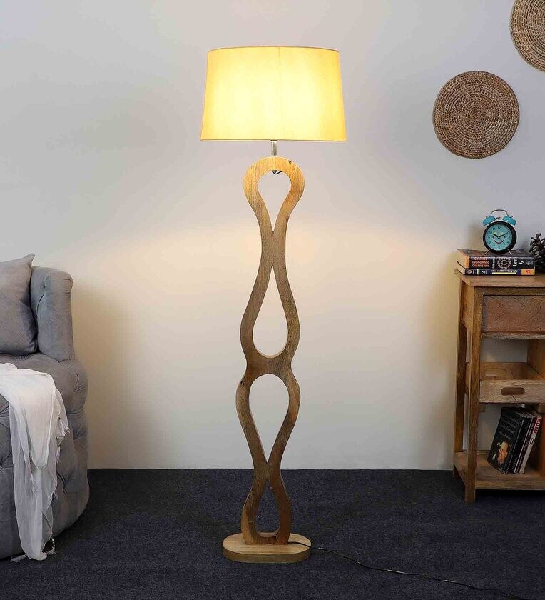 Beige Iron & Cloth Shade Club Floor Lamp With Wood Base