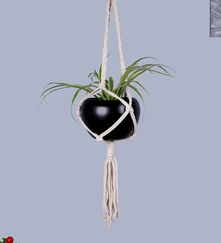 Beige Macrame Medium Hanging Rope Planter with Metal Black Pot (Set of 2)