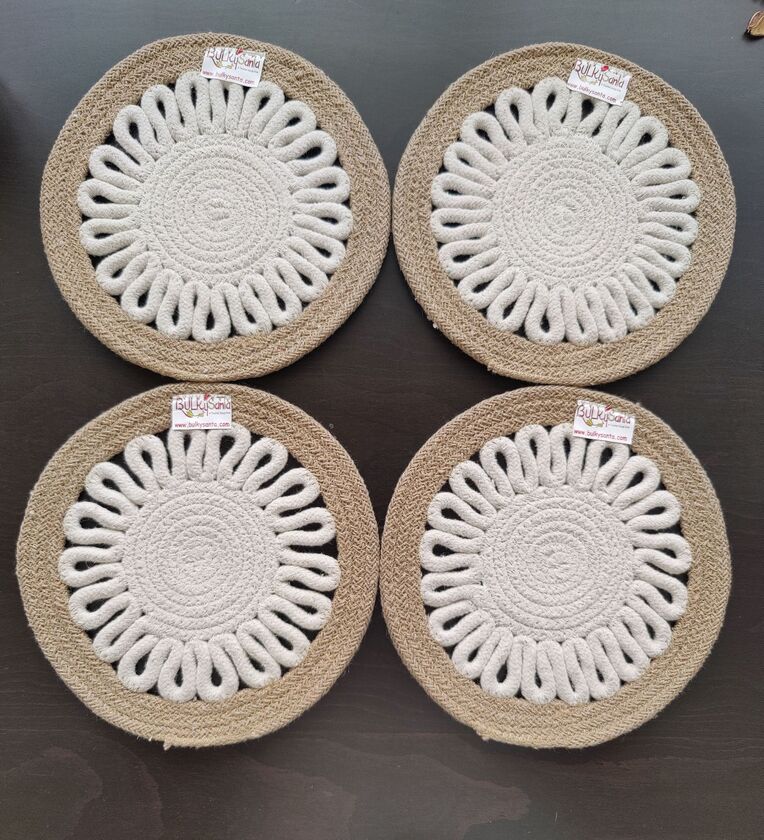 Pack of 4 placemats. Scratch and noise resistant. Reversible Use and machine washable. Useful for hot pans, pots for general decoration like wall d cor. Non-slippery, heat-insulating, colour-fast, odourless, environment friendly. Material Made of high-quality cotton. Shape: Round, Size: 23 cm. Great for daily use or special occasions. These beautiful bulkysanta's placemats or placement mats are eco-friendly and curated with love by our local artisans.