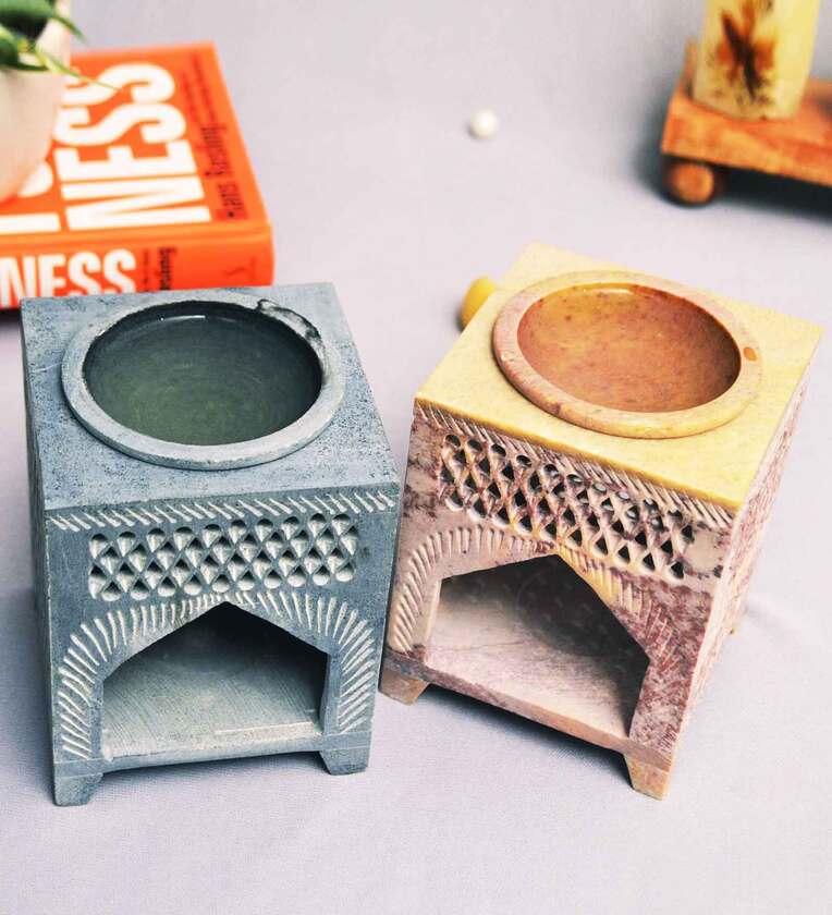 Aromatherapy Artisan Handcarved Stone Oil Diffuser Burner with Tea Light Holder. Hand carved from soapstone by the artisans of rural India. This diffuser is delicately carved from Soapstone. Unique with a natural variation in color of the stone, Our artisans work tirelessly to bring to you perfectly carved pieces. All our products are sourced from traditional artisans from Indian villages who have been using time tested techniques in the handcrafting and this is our small effort to provide some highly needed support to these traditional arts and crafts that are facing a daily struggle to survive in todays world.1. Pack Contains : Oil Diffuser, 1 Essential Oil Bottle, 2 Tealight Candles.2. Dimensions (in inches) : 3.5"x3.5"x4.5" (LXBXH) ; Weight : 600 gms3. Material Used: Export Quality Stone ; 100% Organic and Handmade.4. Great product for home dcor, office dcor, bedroom dcor, yoga and meditation room.5. Great for gifting to friends and family on various occasions such as birthdays, anniversaries, house warming parties etc.?NOTICE?: All rights to use the images are subjected to copyright under the registered trademark Katkaria Creations?. Use of images without permission from the owner can lead to legal proceedings.