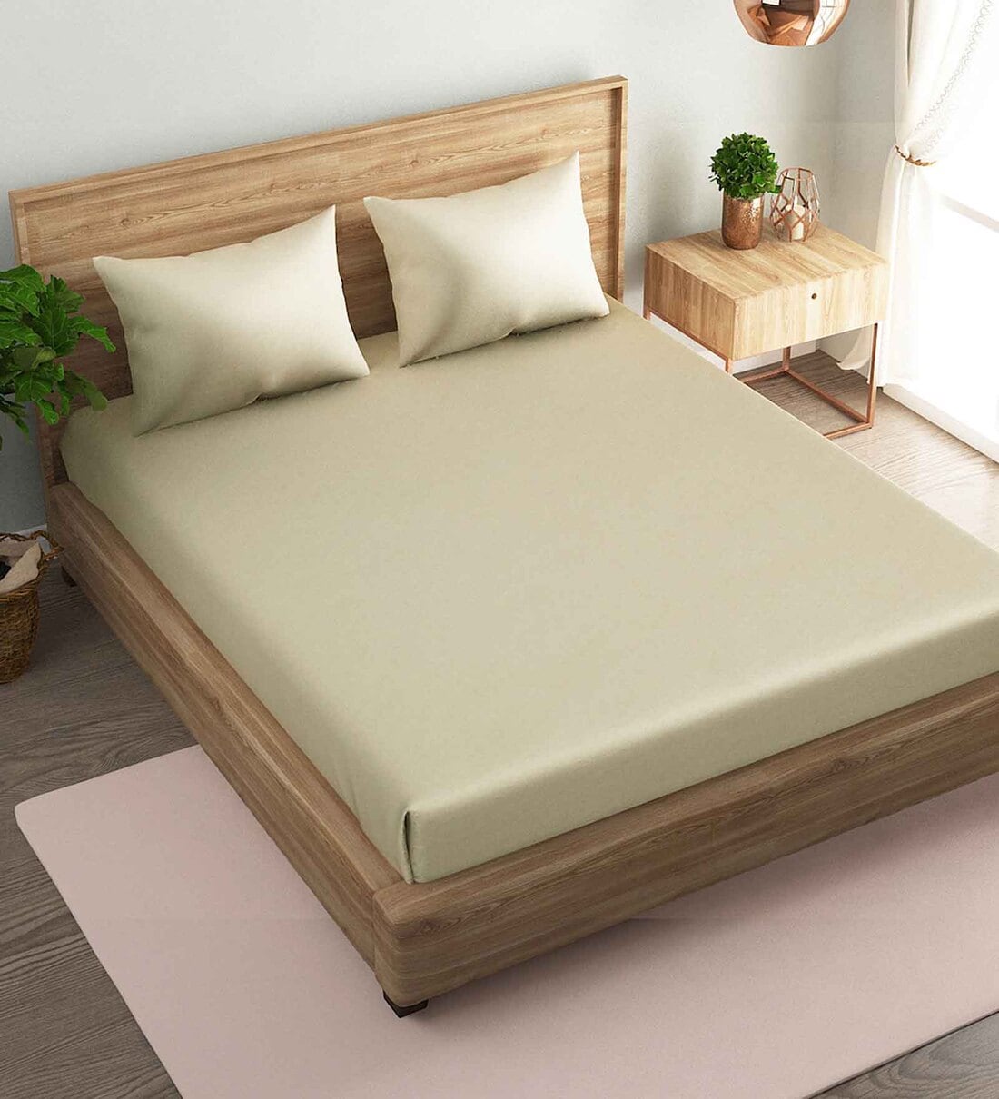 Beige Solid 210 TC Cotton Fitted King Size Bedsheet With 2 Pillow Covers