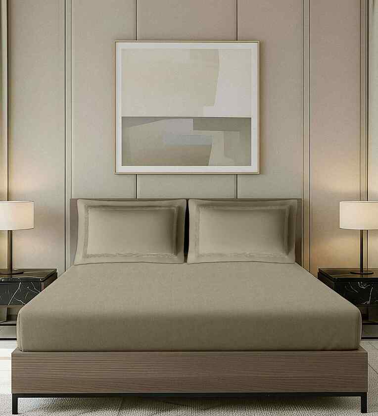 Beige Solid Beige With Geometric Embroidery 700 TC Cotton King Double Bedsheet With 2 Pillow Covers