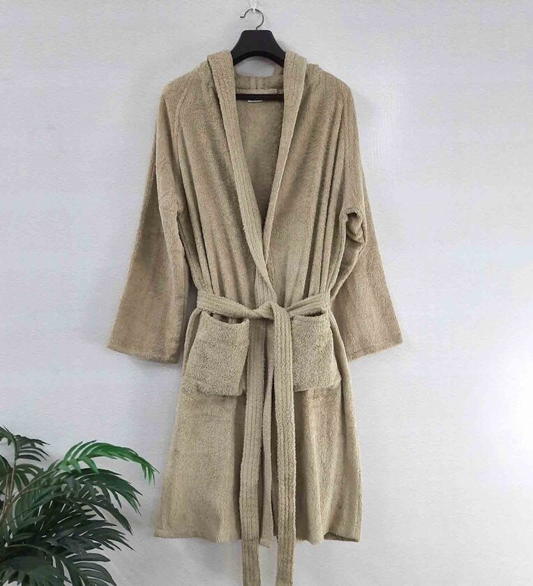 Beige Solid Cotton Unisex Bath Robe (L)
