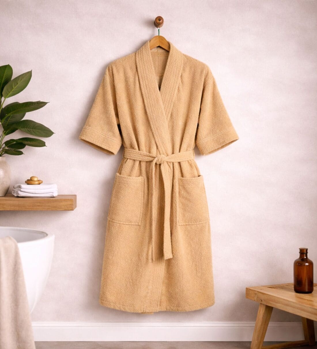 Savor the opulent comfort of the Cotton Microfibre Rangoli Noble Bathrobe Set. This bathrobe, which is constructed of superior quality Terry Cotton Microfibre that is renowned for its softness and toughness, is designed for both men and women. The smooth and incredibly soft contact against your skin is guaranteed by the combed single-ply long-staple Cotton Microfibre yarn. To complete your bath fashion attire, the set comes with a matching pair of slippers. This bathrobe set is ideal for every kind of activity, including swimming, traveling, and leisurely bathing at home. It fits perfectly with your sustainable living choices because it is made entirely of natural fibers and is biodegradable. With a fabric density of 400 GSM, this bathrobe is lightweight yet highly absorbent, providing the perfect balance of comfort and functionality. Elevate your bath experience with the Rangoli Noble Bathrobe Set, a perfect blend of luxury and practicality.