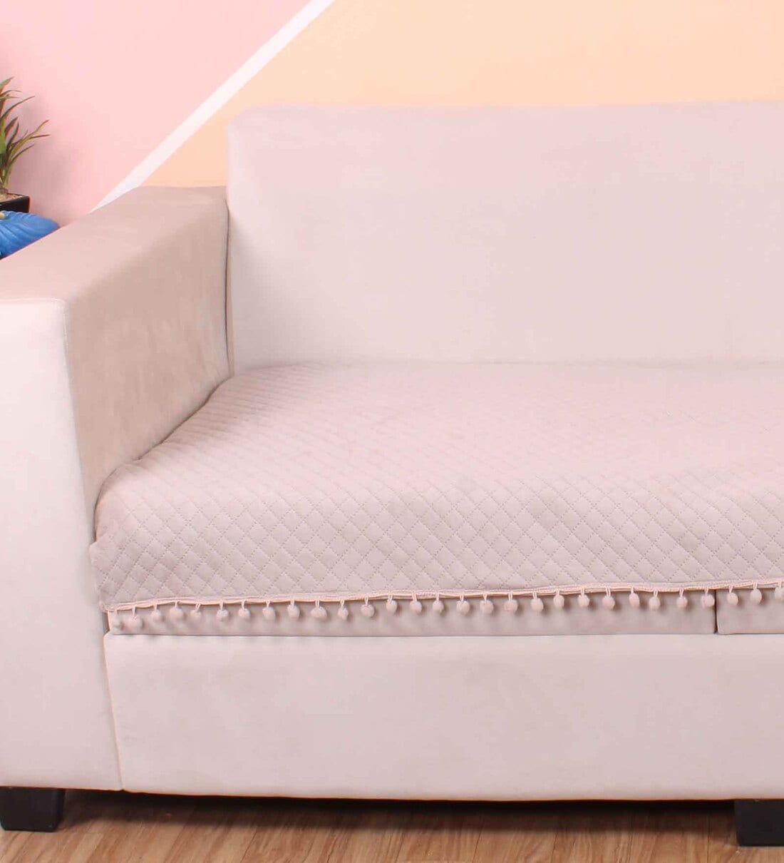 Beige Solid Velvet 1 Seater Quilted Sofa Cover (Protector) with Pompom