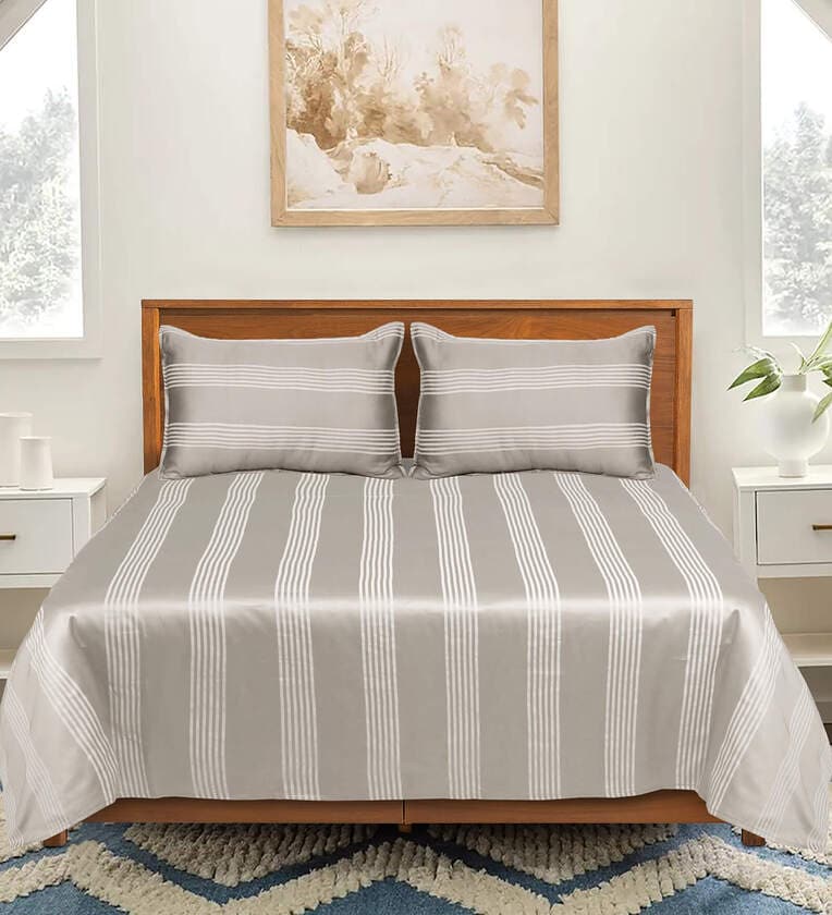 Beige Striped 300 TC Cotton King Bedsheet with 2 Pillow Covers