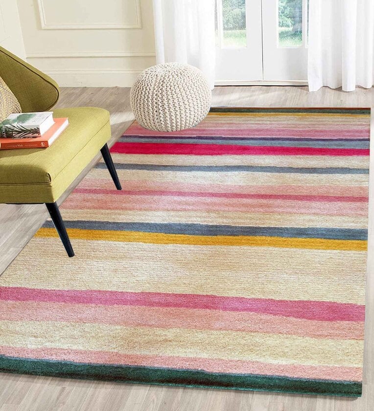 Beige Stripes Wool 4 ft x 6 ft Hand Tufted Carpet