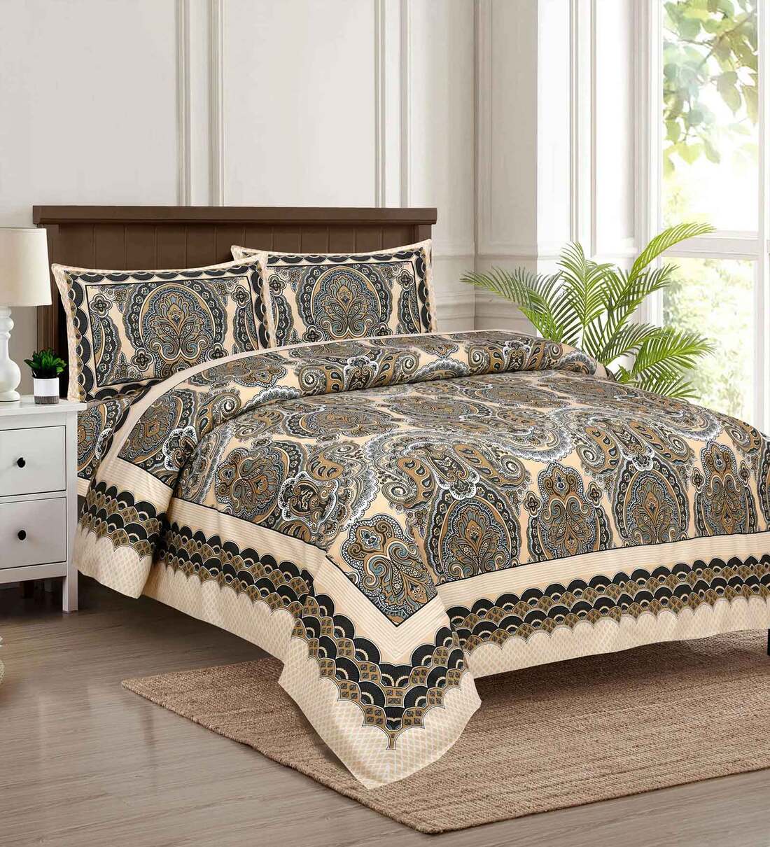 Beige Traditional 144 TC Cotton King Sized Bed Sheets with 2 Pillow Covers