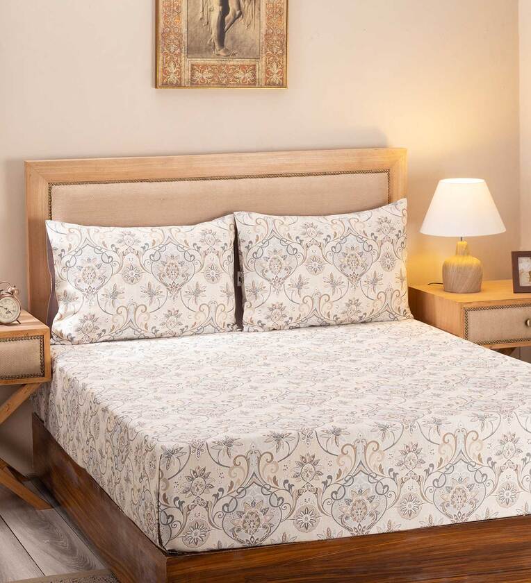Beige Traditional 300 TC 100% Cotton Queen Sized Bed Sheets with 2 Pillow Covers