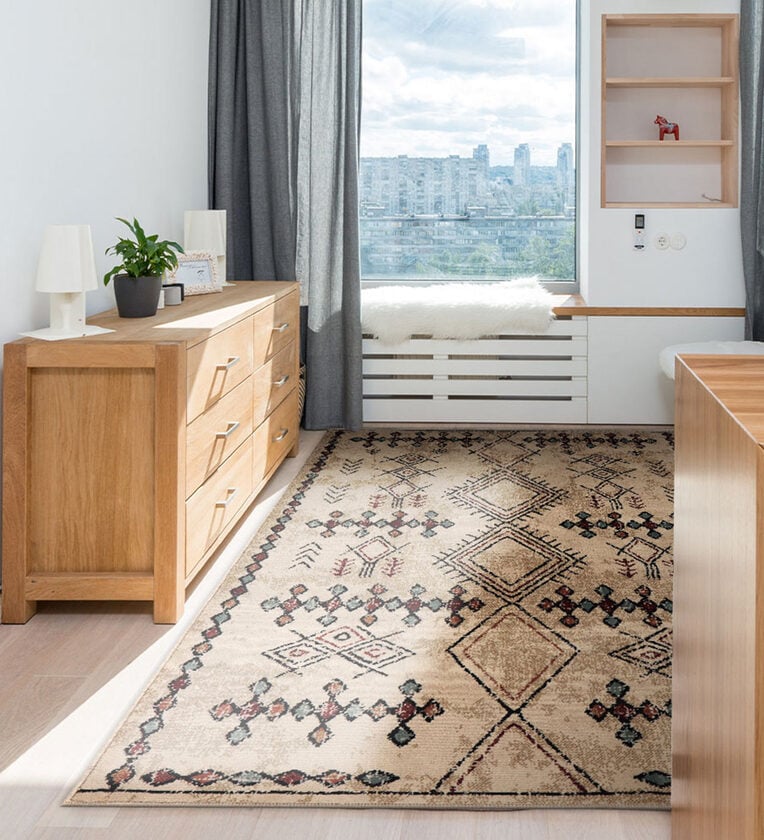 As beige marble effects suffuse over the Mahal 03 Tribe Carpet Area Rug, there is a display of simplicity through tribal motifs and free-hand geometry. For homes in need of minimalistic decor, this Mahal Rug is what you can opt for, with its natural contrast against bright-hued walls and vivid showpieces.