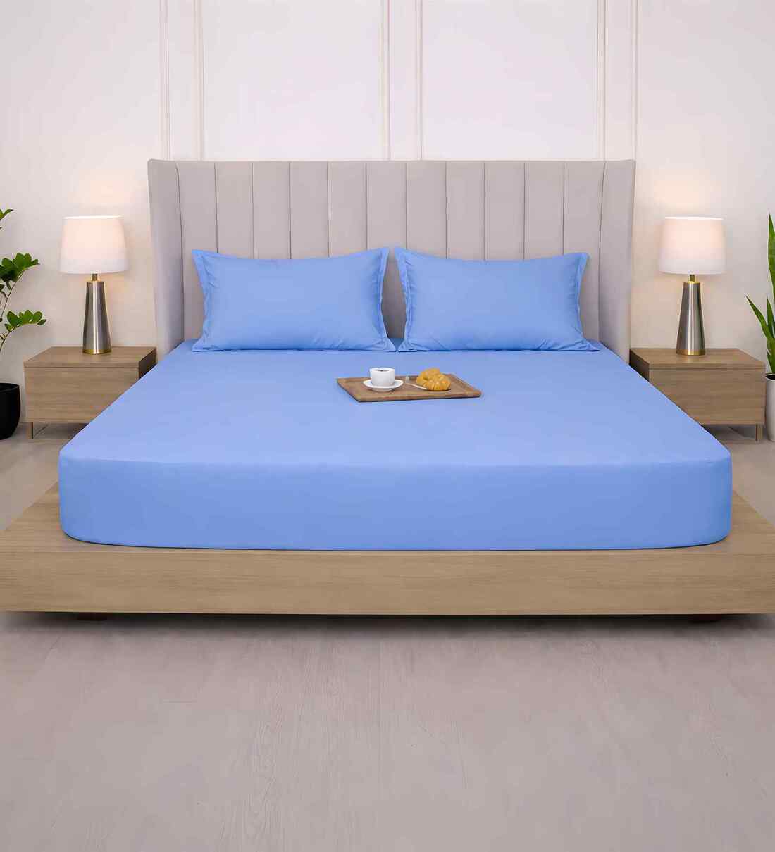 Bel Air Blue Solid 300 TC Pure Cotton King Fitted Bedsheet with 2 Pillow Covers